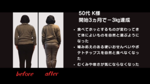 実は、ダイエットカウンセリングを受けたお客様方全員が、3ヶ月ですべてのルールを習慣化して、食べることを楽しみながら3ヶ月で-3㎏~-11㎏のダイエットに成功しています。